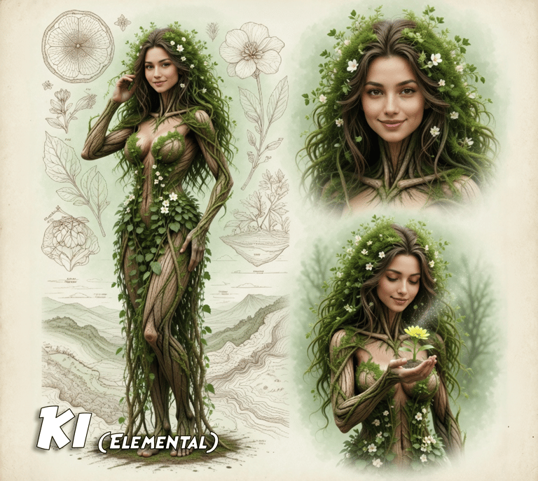 The Nature: Statuesque, with a body of earthen bronze and living stone, her hair woven with moss and leaves.